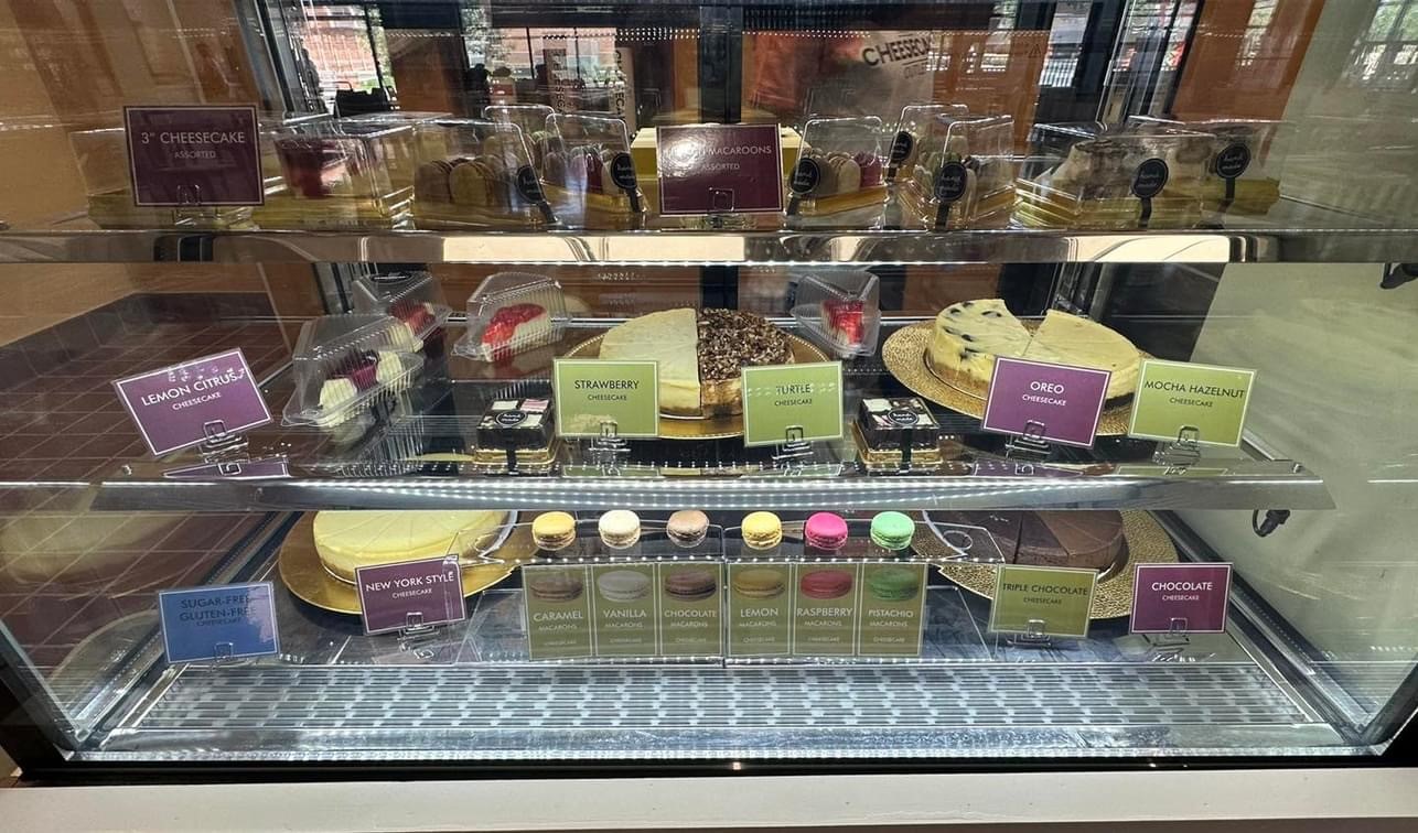 The business also features a variety of tasty macarons, tiramisu, chocolate cheesecake brownies, cheesecake sopapillas, cookies and more. The interior of the Zaragoza location is designed with a simplistic and clean decor that lets the cheesecake speak for itself.
